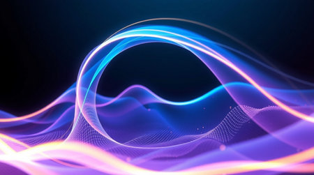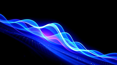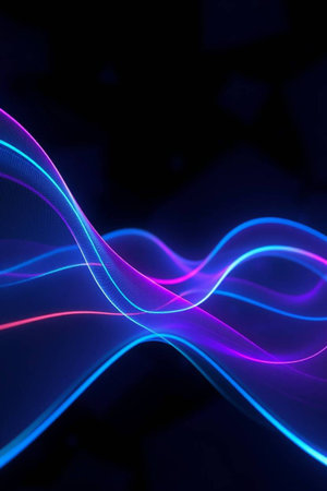 An abstract digital illustration showcases a flowing wave design, rendered in vibrant neon colors against a dark backdrop. The composition features dynamic lines and curves, creating a sense of movement and energy. Suitable for use in various visual communications, the design offers potential applications in modern design and technological projects.