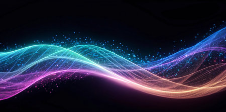 Abstract light waves with shining particles on dark background