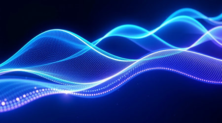 Flowing abstract blue waves with digital dot patterns forming smooth curves in motion.