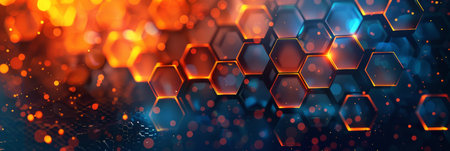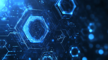 A hightech setting featuring illuminated hexagons and abstract design elements in a futuristic digital theme