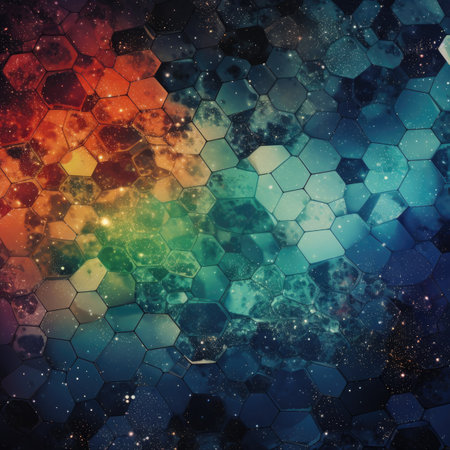 Hexagonal patterns are shown in a shimmering design on a dark background, resembling a modern tech aesthetic filled with light and depth.