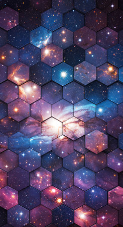 A surreal 3D background where floating hexagonal panels reveal hidden galaxies within each cell. The deep-space aesthetic, combined with glowing cosmic dust and nebula-like hues, gives the impression of interdimensional portals scattered across a futuristic void.