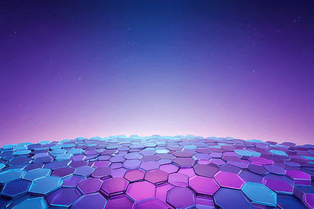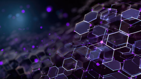 An abstract visual showcases a network of interconnected hexagonal shapes. The composition features a dark background, with the hexagons illuminated in shades of blue and purple. The design suggests a technological or scientific concept, potentially suitable for various applications in design, illustration, and digital media.