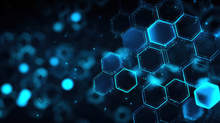 Futuristic geometric background with glowing blue hexagons on a black gradient. Generative AI