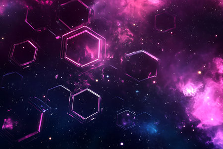 Abstract cosmic background with hexagons and stars. Computer collage.