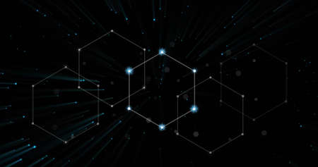 Image of connections and hexagons on black background. Global network, data, communication and technology concept digitally generated image.