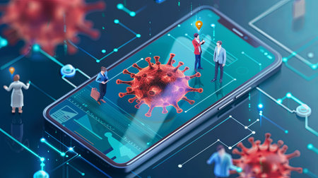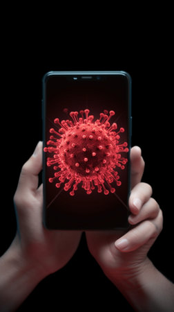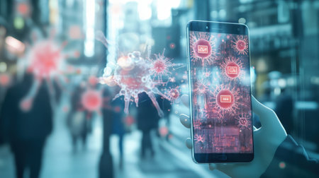 This image depicts a smartphone displaying a digital representation of a virus outbreak, emphasizing technology's role in health monitoring and safety.