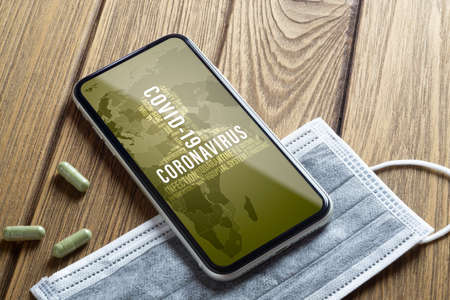 Pandemic Coronavirus or Covid-19 background concept. Mockup mobile phone Covid 19 with facial masks and medicine tablet on wooden table.