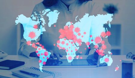 Unrecognizable woman doctor using tablet in office with double exposure of world map with covid 19 coronavirus spread pattern. Toned image.