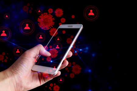 Man using his smartphones and the corona virus comes from touching the screen.