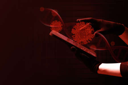 hand hold smartphone for news of blood dna structure virus crisis outbreak pandemic biohazard cell atom disease syndrome