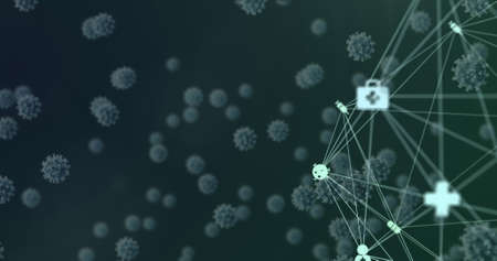 Digital image of Globe of digital medical icons spinning over multiple cells moving against green background