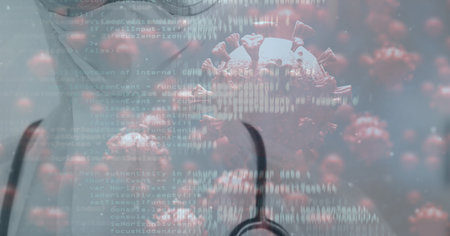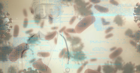 Digital illustration of macro Covid-19 cells floating, data processing over a doctor wearing a face mask. Coronavirus Covid-19 pandemic concept digitally generated