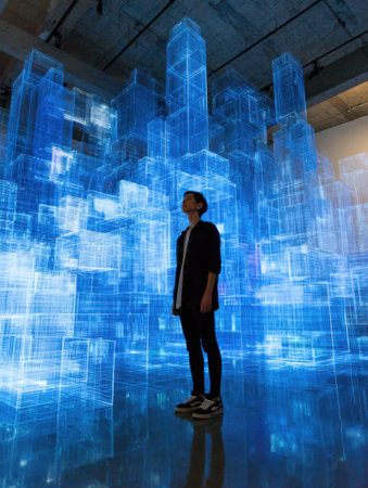 A person stands in awe of a vibrant digital cityscape made of luminous blue structures during an interactive art exhibit in a contemporary gallery.