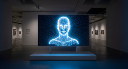 A large screen in a dark art gallery displays a glowing blue wireframe of a human bust. The digital art installation is the centerpiece of the modern, minimalist exhibition.
