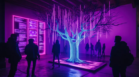 Silhouetted figures surround a vibrant, glowing tree installation in a dark room. Walls display dynamic digital data streams. Pink, purple, and blue lights illuminate the scene, creating a futuristic, technological atmosphere.