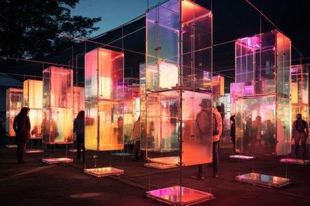 Surreal art installation of floating digital cubes illuminated by colorful lights in dark background