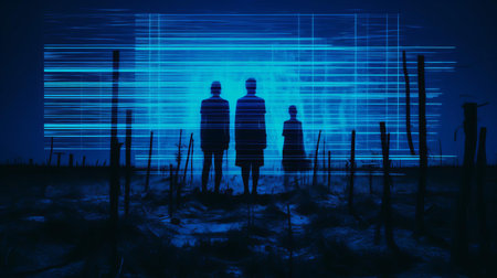 a lonely figure stands amidst a surreal, x-ray illuminated lawn, surrounded by 4 dark, dirty silhouettes, evoking a sense of isolation in this highly detailed, 4k realistic photo. the cobalt blue and glowing neon hues pay homage to the 90's alternative shoegaze era, while the polaroid film aesthetic adds a nostalgic touch, capturing the essence of being a lonely junkie in a world of freaks.