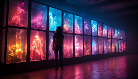 A person stands in awe in front of a mesmerizing display of sparkling lights, Cluster of holographic projections transformed into an abstract display, AI Generated
