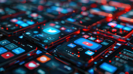 Numerous screens show different social media app interfaces, highlighting the range of digital interactions available today.