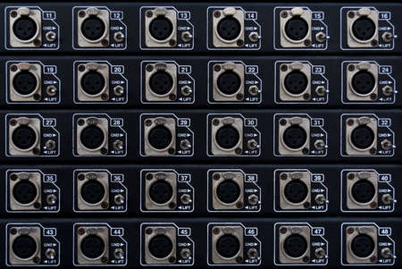 A panel of XLR outlet connectors. The XLR connector is a style of electrical connector, primarily found on professional audio, video, and stage lighting equipment.