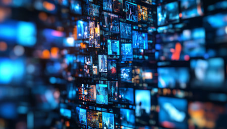 Realistic photography of digital media technology featuring video wall and internet news elements