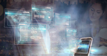 Multiple screens with data processing and smartphone icon against businesspeople and cityscape. computer interface and business technology concept