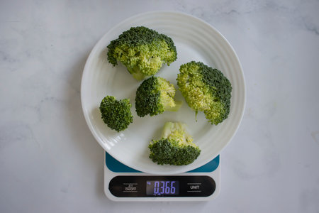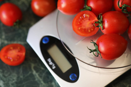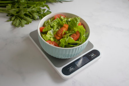 electronic scales for food on the kitchen table, top view. The concept of proper nutrition, diet