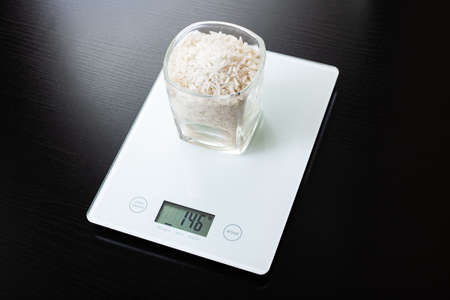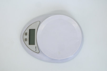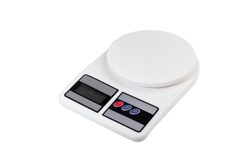Small digital scale for kitchen use, for measuring cooking ingredients isolated on white