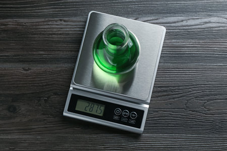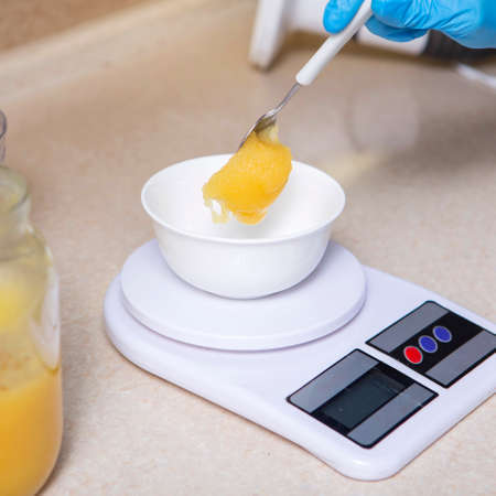 Home scales on the kitchen table, in the background bottles with raspberries in alcohol, making a special cocktail for body massage.