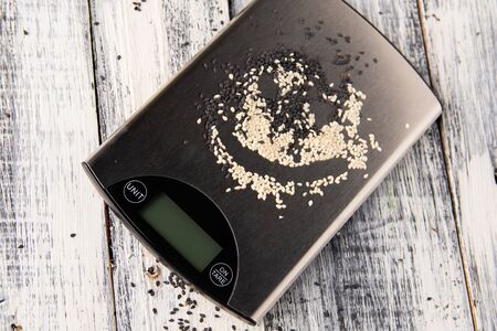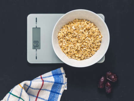 Diet concept, proper nutrition, healthy eating. Oatmeal in a white plate on the kitchen scale. Weighing products. Breakfast, Top View