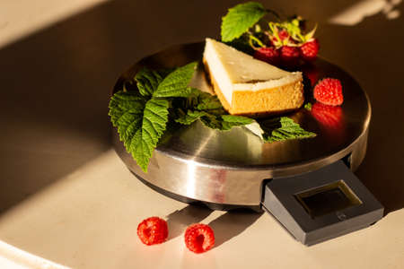 A piece of cheesecake lies on the scales next to a fresh raspberry berry with green leaves top view