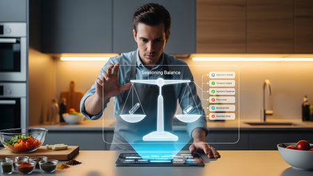 A man in an apron interacts with a glowing holographic scale displaying seasoning data in a...