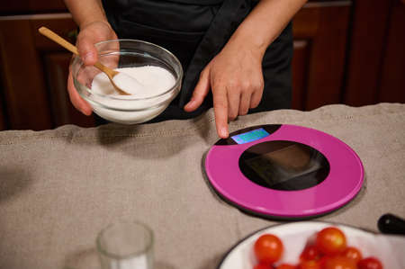 Close-up. Cropped view of a housewife in chefs apron holding a glass bowl with sugar in one hand and adjusting kitchen scale for weighing ingredients, while preparing homemade dishes at home kitchen