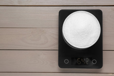 Electronic scales with sugar on light wooden table, top view. Space for text