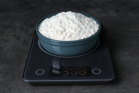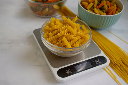 Electronic kitchen scale with bowl of raw pasta on grey textured table. Space for text
