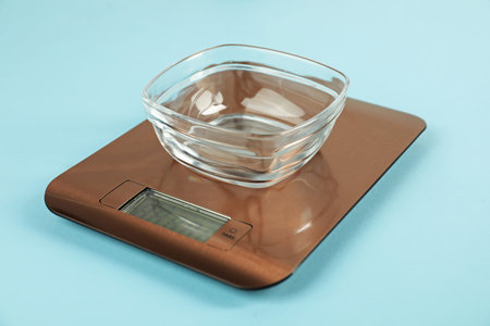 Electronic kitchen scale with empty bowl on light blue background, closeup