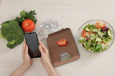 Woman using smartphone at white wooden table with kitchen scale, healthy food and measuring tape, top view
