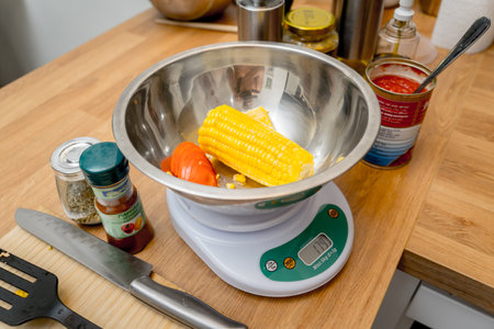 A digital scale is positioned on a kitchen counter, featuring two metal bowls used for measuring ingredients accurately.