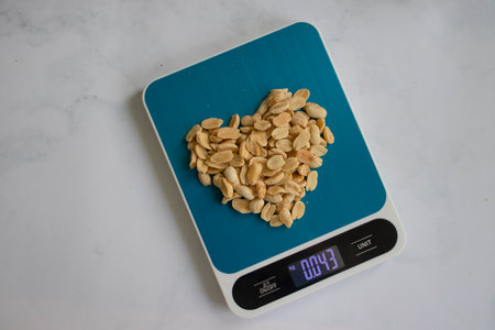 Nut cookies on electronic kitchen scales, accurate calorie counting, proper nutrition