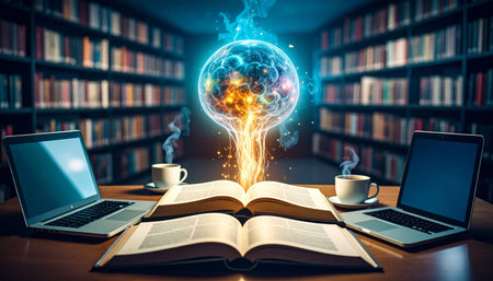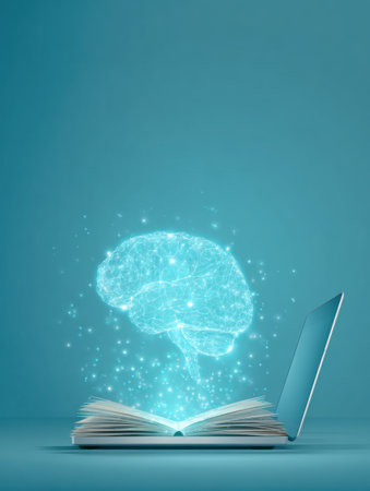 An open book rests against a dark background while a glowing brain illustration hovers above it. This image symbolizes the fusion of knowledge and technology in today's learning landscape, representing innovation and cognitive exploration.