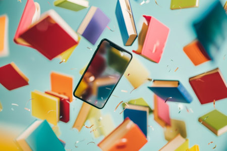A smartphone displaying a reading app on its screen, resting on top of a stack of paper books, all set against a dark black background, highlighting the contrast between digital and print.