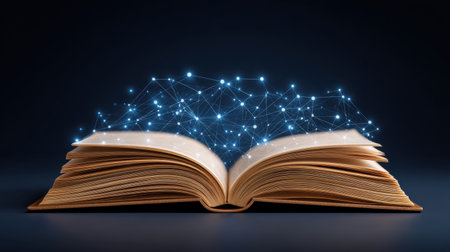 An open book emits glowing data connections, symbolizing the fusion of traditional education and modern technology. A perfect visual for themes in knowledge and innovation.