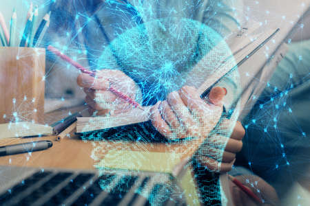 Double exposure of womans writing hand on background with brain hud. Concept of learning.