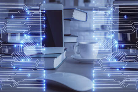Double exposure of tech theme sketch over cell phone background. Concept of technology