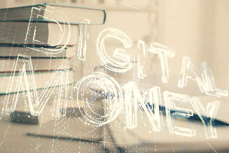 Double exposure of crypto technology drawing and desktop with coffee and items on table background. Concept of blockchain
