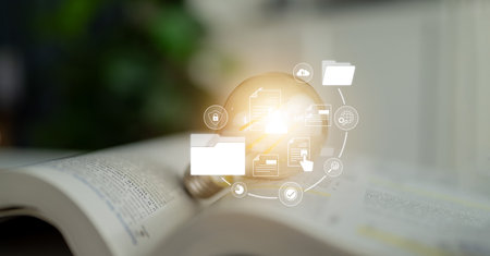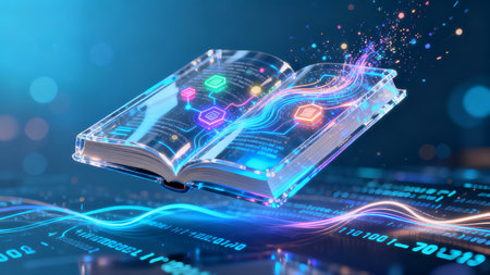 Explore a captivating image of an open book surrounded by dynamic data streams and vibrant technology elements, symbolizing digital education and innovation in knowledge sharing.