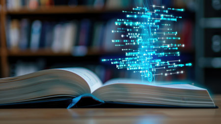 An open book in a library setting, with glowing data particles symbolizing the fusion of traditional knowledge and modern digital technology.