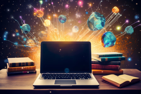 An imaginative representation of books overflowing from a laptop, symbolizing the vast possibilities of knowledge and learning in the digital age. Perfect for educational themes.
