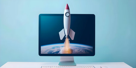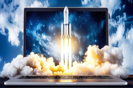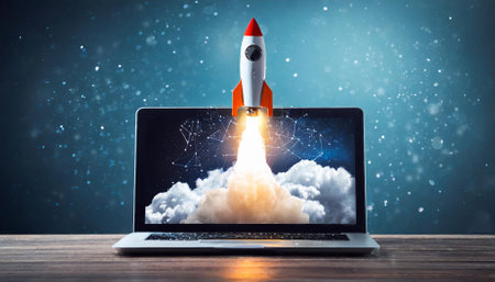 A rocket ship emerges from a laptop